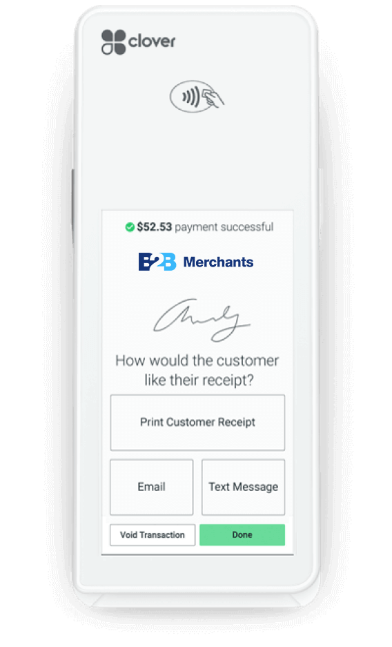 Para los clientes que prefieren un recibo en papel para su transacción, Clover Flex es uno de los pocos dispositivos de su clase que ofrece la comodidad de una impresora integrada. Las opciones para enviar el recibo por correo electrónico o un mensaje de texto también están siempre disponibles.